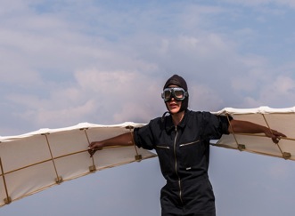 Ein dreidimensionales (Raum)Experiment, das die Flugversuche in einer Form von Darstellung, Klang, Filmprojektion, Aktion und Objekten zusammenführt. Beflügelte Kunststücke !